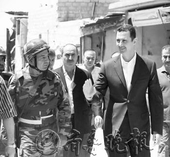 | 8月1日,在叙利亚大马士革郊区的达拉亚,叙总统巴沙尔(右)视察与反对派作战的政府军部队。 新华/路透