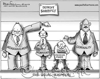 导致底特律破产的四个嫌犯(从左至右)身上分别写着“管理不善”、“缺乏竞争力”、“工会”、“犯罪行为”。“工会”嫌疑犯手拿露底的“养老金”箱子。