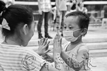 本报实习生 许广强 摄 |  | 3日,在烧烤摊,义工担心慧慧无聊,将孩子带来陪她玩。 本报实习生 许广强 摄 |