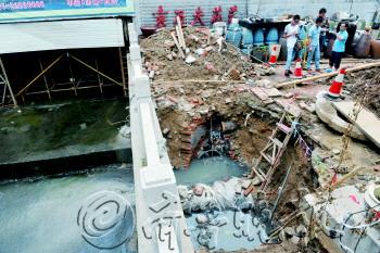 1个月前,南圩子门外街20号附近的市政排污管道发生破裂,污水外溢,严重影响了附近居民生活。然而至今破裂的排污管道仍未修复,而是将泄洪的南圩子壕的壕堤凿穿排污。 文/本报记者 修从涛 实习生 郭凯 片/本报记者 张中 污水流了1个多月,凿开南圩子壕堤排污 “污水都流了一个月了,现在还是没有解决,臭气熏天。”1日,历下区南圩子门外街20号有居民反映,由于楼旁的排污主管道发生破裂,污水外溢严重,严重影响了正常生活和工作。 记者看到发生破裂的排污主管道位于该栋楼房东侧,外溢现场已被挖成了半米多深的大坑,坑底下裸露出直径约半米的市政排污主管道。由于管道破裂,大量污水从管道中流出,位于排污主管道南侧还有一根直径约30厘米的排污支管,污水汩汩冒出。在发生破裂的排污管道北侧就是南圩子壕的壕堤,记者注意到,壕堤已被凿穿了两个直径约20多厘米的窟窿,两股污水通过两个大窟窿流入南圩子壕中。 “现在正是雨季,一下大雨这个地方就往外冒污水,污水井盖都被顶起30多厘米高。前几次大雨,污水直接漫到地面,流到街道上。”附近的一家插花培训机构的孔先生介绍,因为污水外溢导致门前难走,无奈取消了多期的培训计划。 主管道施工难度大 每天派专人值守 排污管道破裂已有1个多月,为何不抓紧修复?1日下午4时许,历下区市政公用局排水科一工作人员表示,自己没去过事发现场,负责的领导都去开生产调度会了,只有自己一人在办公室值班,“听说施工难度非常大,具体的施工计划不清楚。” 据了解,为了防止污水再次外溢到道路上,历下市政部门工作人员将南圩子壕的南侧壕堤凿穿了两个窟窿,污水通过窟窿排入壕沟,每天有2名工作人员值守。 1日下午3点半,记者在事发现场并未找到值守人员,负责南圩子门外街20号楼房管理的山大第三物业中心相关负责人介绍,污水发生外溢之后就联系了市政部门进行维修,“但只是将破裂管道周围挖出了大坑,凿了两个窟窿排污水,20多天了,一直也没有什么进展。” 然而对于凿壕堤排污水的做法,市民并不满意,居民王女士说,“虽然污水暂时漫不到路面了,但是外溢的污水还是有臭味,不治本,万一南圩子壕发洪水,有可能通过两个大窟窿引发倒灌。”