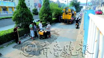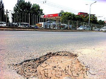 | 5日下午,大坑已经基本填平,等待铺设沥青。 |  | 槐村街上一个马路大坑,已经存在了很长时间没人维修。