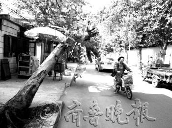 本报2110110消息(记者 张林) 城区英华路上一棵法桐树被货车撞歪,不仅挡住了一小区的大门,还存在不小的安全隐患。对此济宁市中区园林局表示,树木并未死亡不宜伐断,他们将安排吊车将其扶正,重新栽植。 “一棵大树侧歪在小区门口,不仅影响出行,还晃晃悠悠,真怕砸着人。”5日下午2点左右,有市民向本报反映,有一棵侧歪的大树挡住了小区门口,存在安全隐患。记者赶到现场看到,在英华路路西一栋居民楼出口处,一棵直径约30厘米的法桐树呈45度角侧歪在门口。树木的树冠已经剪切,树根翘起,可以看到明显的断裂痕迹。不时有老人孩子从小区出入,调皮的孩子还会在树下穿梭玩耍。 居民苏女士介绍,大约一周前,一辆大货车把树撞歪了,“当时树冠挡住了小区门口,还挡住了一家商店大门,后来有人把树冠锯断了。”苏女士说,4日晚上,一名女子带着孩子骑电动车撞到了树上,腿被摔破了,幸亏孩子没事,“我们这栋楼里有不少老人和小孩,万一树倒下来砸住人,麻烦可大了。” 济宁市中区园林局一位负责人说,发现树木侧歪后,他们安排人员剪修了树冠,减少了占道面积。“经过查看我们发现这棵树并没有死,不宜直接锯断。”该负责人说,他们计划调用吊车把树扶正,然后重新进行栽种,“我们已经挖好了树坑,今天下午6点,工作人员、吊车就能到现场作业。”