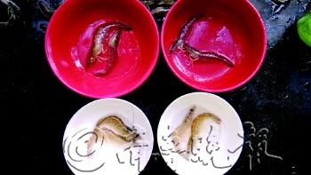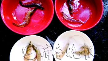 | 最左边是浇过柴油的虾,中间是同一批自然死亡的虾,右边是比这一批更早死亡的虾。 见习记者 张倩倩 摄 |  | 从左下角开始顺时针分别是1号、2号、3号、4号碗,后三者加柴油量逐渐增多。 见习记者 张倩倩 摄 |  | 实验过程中,未加柴油的1号虾已经死亡,而加了柴油的4号虾仍在跳跃。 见习记者 张倩倩 摄 |
