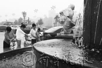 8月5日,城区空气湿度较大,感觉较闷热,外出纳凉的市民在澳德乐广场前的喷泉雕塑边避暑。 本报记者 王小会 摄
