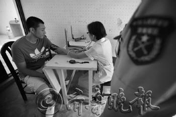 | 医生在给报名入伍的大学生测血压。本报记者 张晓鹏 摄 |