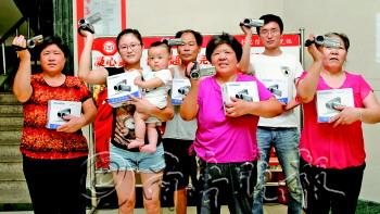 | 市民们展示刚刚领到手的摄像机,他们将用它留下家人的珍贵影像。 |  | 大家在工作人员的指导下学习操作摄像机,这部摄像机简单易操作,几分钟就学会了。 |