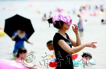 | 6日,在第一海水浴场,游客头顶毛巾防晒。 本报记者 赵金阳 摄 |