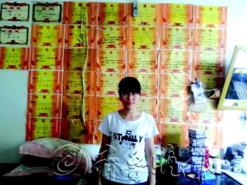 | 在殷丽丽家中的墙上贴满了奖状。 王明婧 摄
