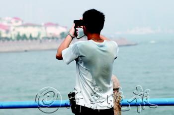 | 6日,在香港西路海边,一名游客的衣服被汗水湿透。