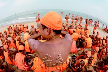 文/片 本报记者 刘涛 通讯员 朱明瑞 张首一 陈壮军 续竞佳 安冒友 进入8月,30℃以上的高温持续多日。8月6日,记者来到济南军区某海训部队训练场,训场上喊杀声、呐喊声伴着海浪声此起彼伏,雄壮的场面热让人热血沸腾。 下午三点,太阳依旧“狠毒”,分组训练的官兵一字排开,经过沙滩四百米跑、俯卧撑、展腹跳等准备活动过后,有顺序地由浅水区进入深水区进行游泳训练,辽阔的海岸线上人声沸腾,训练场面热火朝天。 训练场上,从连长、指导员到新兵,一个个晒得黝黑发亮,呐喊或者憨笑时候,一口白牙格外显眼,甚至,还有不少战士的皮肤已经被晒爆了。 据悉,7月20日该部在日照黄海海域展开海上适应性训练以来,他们注重按“能打仗、打胜仗”的要求,坚持实战标准不放松,从难从严进行训练,在炎炎烈日下官兵们斗酷暑、练技能、战大浪,不断锤炼着海上真功夫。 “高温下的训练不仅对战斗力是一次催生,对官兵们的生理、心理以及意志、作风等也是一次脱胎换骨的锤炼和考验。尤其对于许多第一次参加海训的新战士来说,要通过类似高强度的训练,让他们破茧成蝶,更快地成长成熟。” 该部部队长路红卫说。