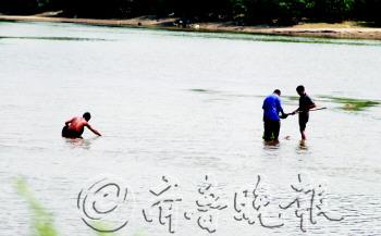 | 8日,在事发现场河流的上游,有村民正在河里摸蛤。 实习生 许广强 摄 |