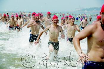8日上午,青岛近万名游泳爱好者涌入汇泉湾,以畅游的方式纪念“全民健身日”,游泳路线起点在第一海水浴场西侧,至浴场东侧上岸,全程约1100米。