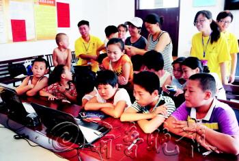 暑假期间,曲阜师范大学的青年志愿者来到曲阜、泗水等地的留守儿童较多的乡村支教,给孩子们进行课业辅导。图为曲阜时庄街道双庙村,孩子们在学电脑。