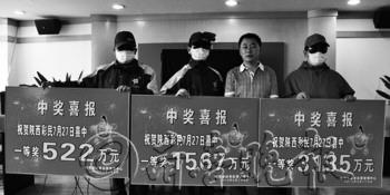7月27日,超级大乐透第13086期井喷16注头奖,每注奖金500万元,陕西榆林府谷一网点包揽10注,共获奖金5224万元。据悉,10注头奖全部落于榆林市第27219号投注站。分别出自三张“6倍、3倍、单倍的11+3”大复式票,三张中奖票出票时间仅隔一分钟,据以往经验来看,一人所中的可能性极大。直到8月1日上午,来自榆林的三位彩民相约来到陕西省体彩中心,这个谜底才被解开,原来中奖者不是一个人,而是三个人,中得奖金分别是3135万、1567万以及522万元。 根据三位中奖彩民张先生、王先生、李先生(均为化姓)透露,他们本就是三个好哥们,三人都做小生意,而且,三人都有着共同的爱好——玩彩票。7月27日这天,三人在一起吃饭喝酒,酒过三巡,大家都有些兴奋,就相邀一起去买彩票,碰碰运气。来到投注站,李先生研究了一番走势图之后,选出了一组11+3的复式号码,张先生、王先生看了之后,也表示很看好这组号码。于是,李先生率先打了1倍,紧接着,张先生打了6倍,最后,王先生折中了一下,打了3倍。 据了解,三位大奖得主平时买彩票也没有固定的投入资金,有时候心情好了多买点。王先生说作为一名普通人,中了几百万甚至上千万的大奖后,总有一种“天上掉馅饼”的感觉,三位大奖得主也对这块“馅饼”有着自己的规划,他们表示,虽然这次中了大奖,但是今后仍旧会坚持买彩票,如果中了那最好,不中就当为社会献了一份爱心。