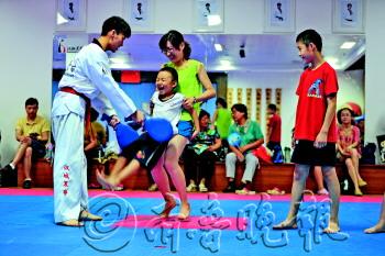 8月8日,在济南全民健身中心跆拳道馆,一名体验的小男孩由于动作做得不标准,妈妈忍不住上前帮忙,母子同试身手。当天是全国第五个“全民健身日”,济南市全民健身中心、济南奥体中心发放了数千张免费体验券。不过,由于当天不是节假日,免费体验的人并不多。不少市民表示,希望免费健身体验能成为常态,不只是限定于8月8日这一天。 本报记者 王媛 摄