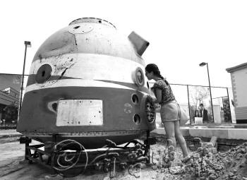 | 记者近距离接触神舟飞船返回舱。 本报记者 钟建军 摄 |