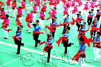 8月8日是全国第五个全民健身日,当天上午,在德州市体育中心,300多位老太跳起“骑马舞”。
