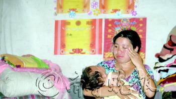 | ▲小云新的母亲抱着小女儿伤心痛苦,背后是小云新的奖状。