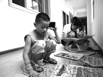 | 一名小报童和妈妈一起插报纸。 本报记者 化玉军 摄 |