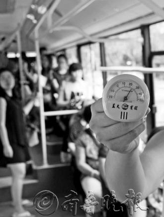 | ◤8日上午,K1线空调车上的温度为25℃左右,车外温度高于30℃。 记者 王震 摄 |
