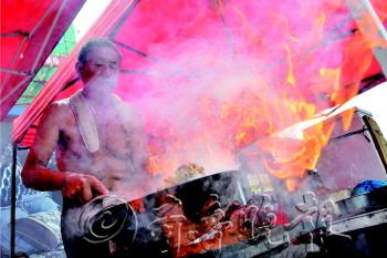 | 7日,临淄区最高气温达37.4℃,在晏婴路边,大排档摊主于师傅在高温下炒菜。