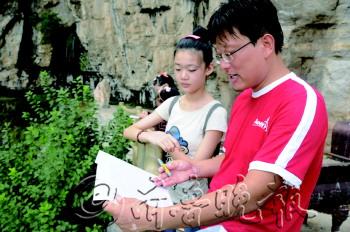 本报8月8日讯 (见习记者 孙华飞) 8日清晨6点,孩子们一行向齐山进发。孩子们都非常兴奋,除了登山外,孩子们还有一项任务——山上作画。 小朋友们都被齐山美丽的景色所吸引,在登山的途中健步如飞,没多久就来到了“观音瀑”,几个口渴的孩子都拿着自己的杯子去盛清凉的泉水喝。 安利的志愿者之一高俊将孩子们召集到凉亭里,美术课开始了。“咱们自己的手就是最好的取景器,同学们伸出双手像老师这样,选取一个自己觉得最美的景。” 高俊又向孩子们讲解了近景,中景和远景。“面前的这座山,是不是岩壁很陡峭啊?观察景物的独特之处我们画起来也更容易。” 高俊边讲边画,寥寥几笔,就勾勒出了身旁的山石和古栈道。孩子们也按照老师的讲解画起来。 岳媛媛说:“我小学的时候很喜欢画画,不过在我们村里却很少能学到。” 孩子们在给自己的画上色后,作品基本都完成了,纷纷向老师和周围的孩子展示。高俊老师对作品进行了点评表扬。“要是每天能在这么美的地方上课多好啊。”孩子们纷纷感慨。