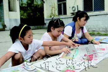 袁子涵(左一)和表姐、妈妈领完报纸后一起插报。 本报记者 李超 摄
