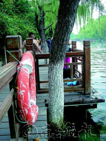 相关链接 轻生女子投水自尽 救生设备派上用场 本报8月10日讯(见习记者 王皇) “有人落水了!”8月4日在护城河泉城广场段坤顺门桥附近钓鱼的市民发现一名轻生女子投河自尽,环城公园管理处副主任于勇驾导航船正经过泉城广场附近河道,接到对讲机报告后立马调转船头,及时赶到了落水处,使用船上救生杆顺利将女子救出。 导航船平日为水上公园游船开道,和环卫船船型一样,但为了方便救人,没有安装打捞垃圾的网。于勇告诉记者,15只机动船上都放置了救生杆、救生圈和救生衣。环卫船主要负责清理河道,若遇到落水险情,巡逻人员和船只通过对讲机快速联络,最近的船能迅速到达落水地,对落水人员进行营救。 于勇告诉记者,每周会有五六个人落水,仅公园管理人员今年就已救上落水群众十余人。泉水浴场每年约有100人落水,仅浴场护池员今年就已救上60多人。 救生圈不是游泳圈 非紧急情况不能用 本报8月10日讯(见习记者 王皇) 在护城河西河段、东河段,部分游客爱把沿岸的救生圈当游泳圈使,顺手拿走。环城公园负责人表示,救生圈不是游泳圈,非紧急情况不应使用。 “沿岸放置的是泡沫型救生圈,应在紧急情况下使用,不能拿去当游泳圈使。长期泡在水中会受损,泡沫受损后救生圈就失去浮力,只能作废。”环城公园王是龙主任告诉记者。 “救生圈比较轻,不易砸伤落水人,紧急情况下能实现远距离扔投,使用起来很方便。随意将沿岸放置的救生圈当游泳圈用,不但缩短其使用寿命,更重要的是会在紧急情况下耽误救命。”王是龙称,护城河沿岸救生圈的放置高度都经过专门测量,所以不能乱动。