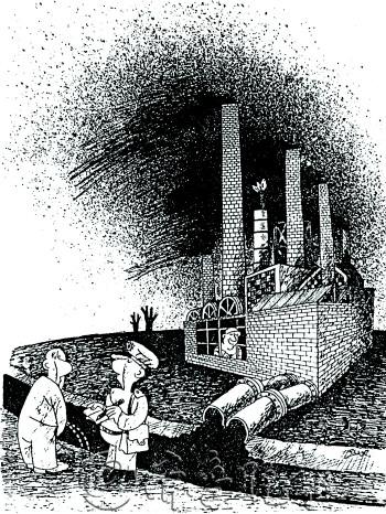 漫画的灵魂是点子。但仅有点子是不够的,还需要场景的巧妙设置和技法的精心渲染。 如图所示,是一则针砭污染的漫画。从场景设置上看,如果把厂房内那得意的排污者删掉;把林立的烟囱和远处的枯树也删掉,这仍不失为一幅好的漫画。因为作者用排污来反衬撒尿,已经对“小污被罚”而“大污逍遥”的“严格执法”进行了有力的讽刺。 但漫画家没有就此止步,又用排污者的窃喜来反衬被罚者的无奈;用烟尘满天、万木枯死来反衬执法者的视而不见,把主题表现得更加充分。从绘画手法上看,浓墨重笔,精心刻画,把整个场景渲染得如临其境;把三位先生的心理活动刻画得入木三分,达到了炉火纯青、无以复加的地步。 何止于此,漫画家还透过环境的污染,洞穿了执法者心灵的污染。 (王雪巍)