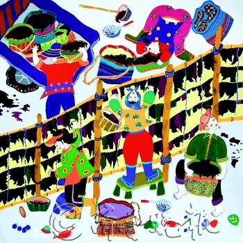 (日照农民画院院长姜孟华):现在国家倡导文化大繁荣大发展的策略方针,农民画在全国获得广泛推广。日照农民画在长期探索过程中,以三方面促进了农民画产业的繁荣。首先,日照农民画积极参与各大文化展会,并以此实现品牌推广。其次,积极发动农民画家进行队伍建设,组织创作、展览互动,将他们团结、吸收到农民画创作群中;第三,通过农民画衍生品研发,将原来“身份”不高,但却具有乡土生活气息的农民画创意,应用到生活用品上,如纺织、家居产品等,不仅令更多人了解到乡土文化,也可带来效益。而农民画鲜艳的色彩与吉祥的寓意,也符合了人们的生活审美标准。