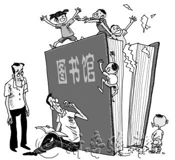 8月8日,郑州图书馆新馆试运行,不少市民带着孩子来体验。小孩子尖叫哭闹、乱撒尿、嬉戏追逐等行为却影响阅读环境。因此新馆决定,12日起暂不接受14岁以下未成年人进馆。 漫画/李宏宇