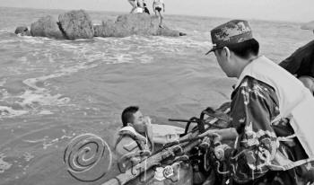 | 民警驾船未能靠礁,抛绳索才营救成功 | |