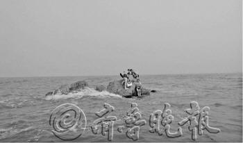 | 民警成功将游客救上船。 本报记者 李泊静 摄 |  | 游客被困在礁石上。本报记者 李泊静 摄 |