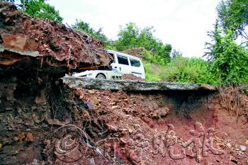 | 通往白云村的盘山路上出现塌陷。本报记者 穆静 摄 |  | 锦绣川水库北侧出现滑坡。本报记者 穆静 摄 |