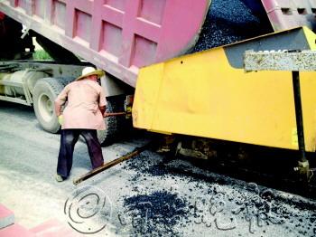 | 顶着烈日,筑路工人赶紧施工。 |  | 刚刚清扫了一段路,窦大姐就已经满头大汗。 |