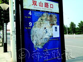 双山路口站牌损毁严重,9路公交车线路及开往方向完全看不清楚,站牌上还张贴着小广告。 见习记者 赵克 摄