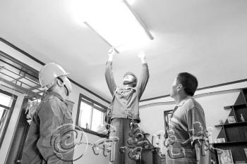 济宁供电公司营销部北湖营业所的工作人员深入企业、居民家中进行全方位服务。他们为68户专变用户、9个行政村、3719户“四到户”、1346户一级低压居民户提供供电服务。图为工作人员为居民维修灯具。