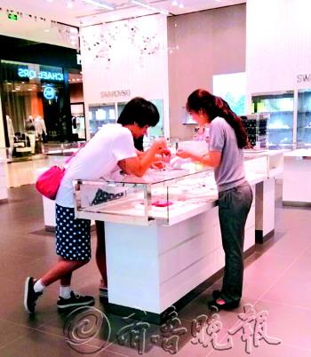 | 12日,一对情侣在振华商厦买首饰。 见习记者 张倩倩 摄 |