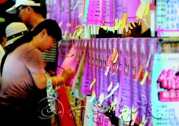 | 8月12日,本报七夕相亲会的第二天,很多展板上都贴满小纸条。 本报记者 马志勇 摄 |