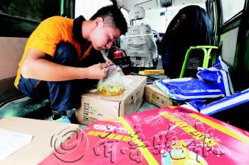 文/本报记者 张建丽 片/本报记者 邓兴宇 持续炎热的天气,让很多人都想“蛰伏”在空调房里。然而有这么一群人,他们必须迎着火辣辣的太阳,每天汗流浃背奔波在路上,他们就是投递员。如今正值高考通知书的投送高峰期,在这样的天气,他们的工作越发辛苦。 12日,记者跟随山东邮政速递物流有限公司菏泽分公司的投递员党新,一走他的投递路。党新今年23岁,从事快件投递工作已经3年了。 上午7点多,党新赶到公司,开始一天的忙碌。首先是分拣。公司的投递员共有15人,每人负责不同的路段,他要把快件整理一下,分拣出自己的快件。然后是扫码,把快件上的条码扫描到电脑上,安排投送。第三个步骤是排段。党新这次要走人民路、八一路和黄河路,他根据这几条路,把自己要送的快件具体地址,由南到北地排好序。接下来便是装车了。党新拉着装满快件的大箱子,将70多件快件一个个搬到车上。 一路奔波,走到半途中,党新就要打电话通知收件人。到达指定地点后,收件人若没来,还要接着打电话。通知、等待、通知、等待……除了开车,投递员的时间就在不停地打电话中度过。党新告诉记者,他一年打坏了3部手机。有时收件人迟迟不到或者面包车难以开进去,党新还要一路小跑,爬到楼上去送件。汗水流了干,干了流。 午饭,党新就在面包车的车厢里解决了。因为去找饭店或者回家,都会耽误本来就不宽裕的时间。一份凉皮,简简单单,这就是他的一顿午饭。打开后车门,如果足够幸运,党新还能感受到阵阵轻风。 下午2点左右,第二批快件就要到了。吃完凉皮,党新就要迅速赶到公司,重复上午的工作。到了晚上七八点,送完能送的最后一份快件,党新要做最后一项工作:平单,就是统计一下这一天总共送出去了多少快件,还剩下了多少快件。如果所剩快件数量较多,终于结束一天工作的党新并不轻松,这是他的一个心事,它意味着党新第二天的工作要更加卖力……
