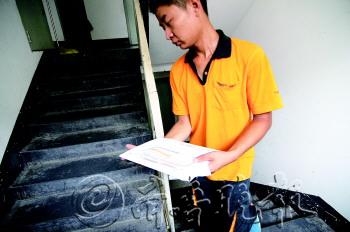 | 车内没有空调,温度达到40℃以上,党新手臂上全是汗水。 |  | 烈日当头,党新花5块钱买了份凉皮躲在车厢里吃了起来。 |  | 今天上午要送的包裹和快递就有满满的一大箱。 |  | 大学录取通知书要保证送到本人手中,党新正在认真整理。 |  | 送快件每天爬楼是不可避免的。 |  | 每天都要打上百个电话,一年用坏了三部手机。 |