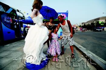| 一名女孩摸了一下“婚纱”,发现是纸做的。