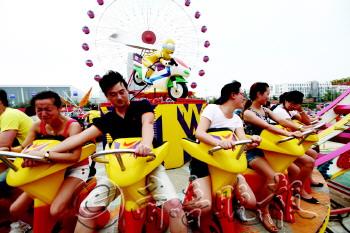 吉林游客连玩三遍“旋风骑士” 在嘉年华游乐场,最具人气的莫过于“旋风骑士”,这是一款比跳楼机更有安全感却又不乏刺激的大型游乐设备,吸引了很多青少年游客。 带着头盔披着斗篷开着摩托车的“旋风骑士”立在一个飞盘中央,飞盘沿着弧形轨道不断上升旋转,飞盘上设有十几个座椅,座椅前有一个形似汽车方向盘的扶手,供游客抓紧。转盘开始转动时,不少游客表现得很轻松,当转盘越转越快,人们就开始跟着“旋风骑士”的节奏尖叫。三分钟的体验结束后,不少游客都被转晕了,不过也有没玩够的,还“赖”在上面不走,准备交钱再玩一次。 “我都玩儿三遍了,太过瘾了。”从吉林来的马庆山说,他老家就是青岛的,年年夏天都带着老婆、孩子回青,每次都会来啤酒城嘉年华游乐场玩。 嘉年华里儿童欢笑多 年轻父母最关心的就是啤酒城有没有适合儿童玩的游戏设备。记者在嘉年华游乐场转了一圈,发现还真不少。 嘉年华游乐场入口处的水上碰碰船就吸引了不少儿童。一个超大的橡胶游泳池里注满了水,水上漂着十几只各式动物造型的橡胶船,每艘船安装有一个发动机和一个方向盘。橡胶游泳池里五六个小孩子每人驾驶一艘小船,在水面上游来游去,互相碰撞,乐得哈哈大笑。 跟着父母来啤酒城游玩的冯童童说:“我最爱玩这个船,别的游戏现在不敢玩,等长大我再玩。”冯童童的妈妈告诉记者,带孩子来啤酒城前,还担心没有适合孩子玩的游戏,来了才发现“白担心了”。