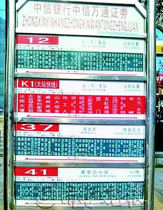 | K1线虽然刚刚启航,但各大站公交站牌处,K1线的运行线路早已更新,跃然牌上。 |