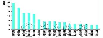 7月份我省蓝天数(能见度≥10公里) 7月份我省PM2.5数据 本报8月14日讯(记者 林媛媛 实习生 岳岑) 近日,省环保厅发布山东省大气环境质量7月份17城市排名,在能见度、细颗粒物(PM2.5)、可吸入颗粒(PM10)、二氧化硫(SO2)、二氧化氮(NO2)等5项指标中,威海和烟台都位列前茅,当数山东7月最干净城市。 7月,备受市民关注的细颗粒物(PM2.5)浓度最低的城市是烟台,为42μg/m3,最差的城市是德州,为85μg/m3,济南倒数第二。而可吸入颗粒(PM10)浓度最低的城市是威海,为68μg/m3,最差的城市是聊城,为169μg/m3,济南倒数第三,青岛同比恶化幅度最大。 “蓝天白云,繁星闪烁”天数最多的城市威海为29天,而最少的城市淄博和菏泽都只有5天。 数据还显示,7月全省空气质量良好率平均为80.8%,同比持平;细颗粒物(PM2.5)平均浓度为69μg/m3。