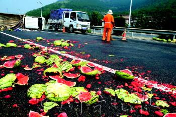 8月14日下午,在济南绕城高速上,章丘高官寨镇的一辆载瓜车发生侧翻,车上的5000斤西瓜滚落一地,大多都已碎裂,所幸车上的瓜农夫妇并无大碍。事故发生后,高速路政人员及时设立隔离带,并帮助瓜农将少数完好的西瓜装车。