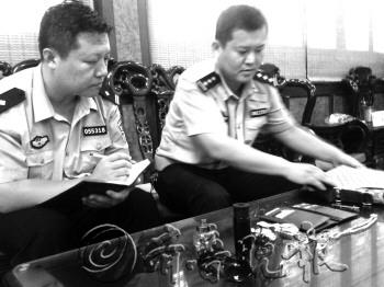 | 民警在检查杨某某假装“富二代”的道具。范少伟 摄 |