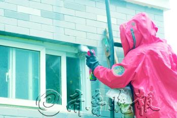 | 身穿防化服的消防战士在摘除蜂窝。路帅 摄 |