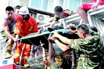 | 消防人员用担架将欲跳楼男子抬下消防车。 |
