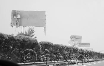 连日来,大风将京台高速德州段两侧的不少广告牌吹折。14日,被大风摧毁的广告牌挂在铁架上摇摇欲坠。 本报记者 马志勇 摄